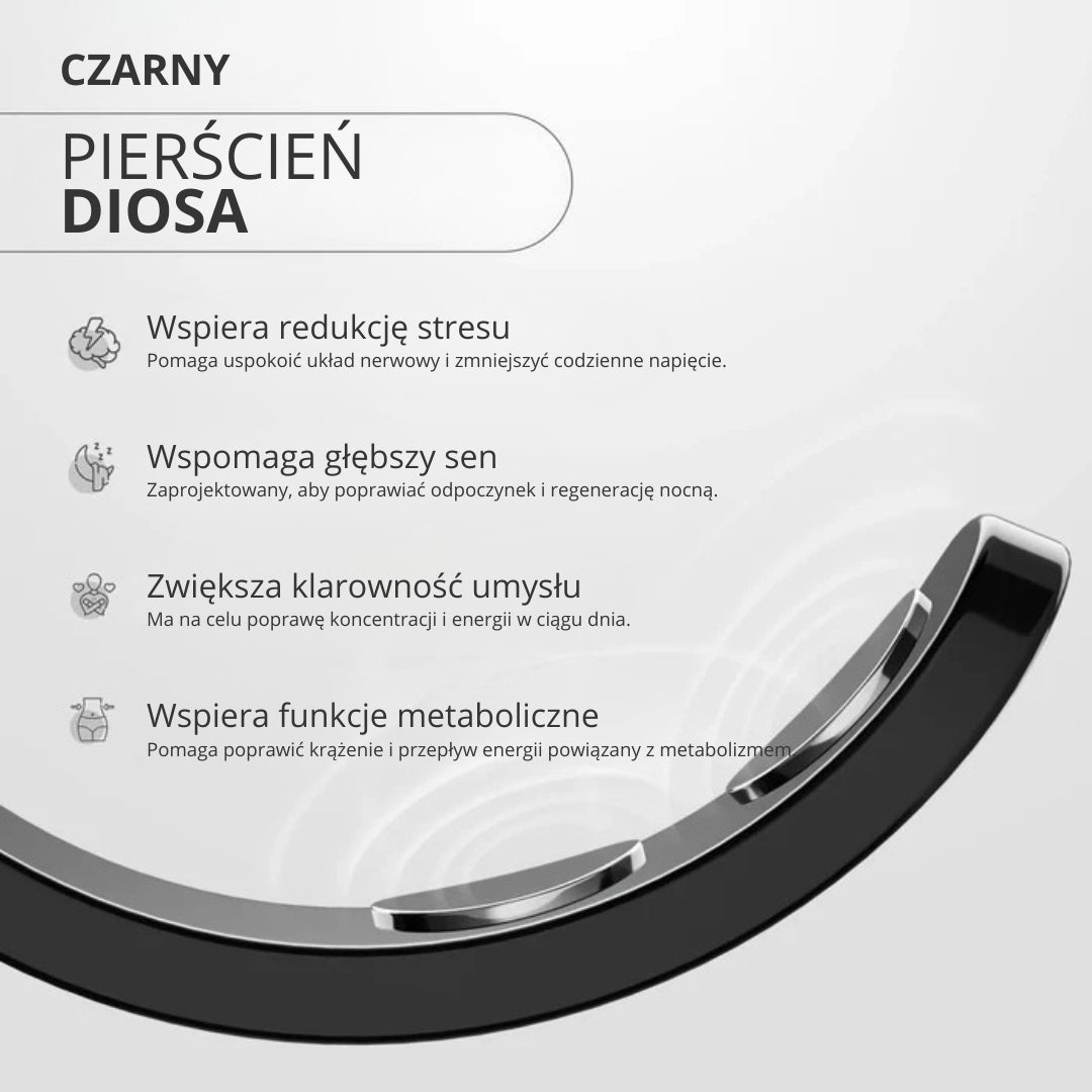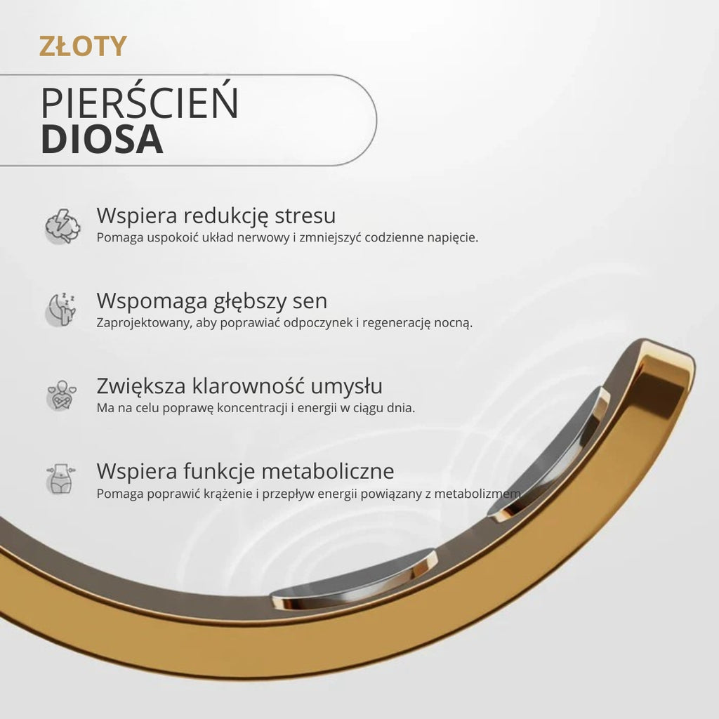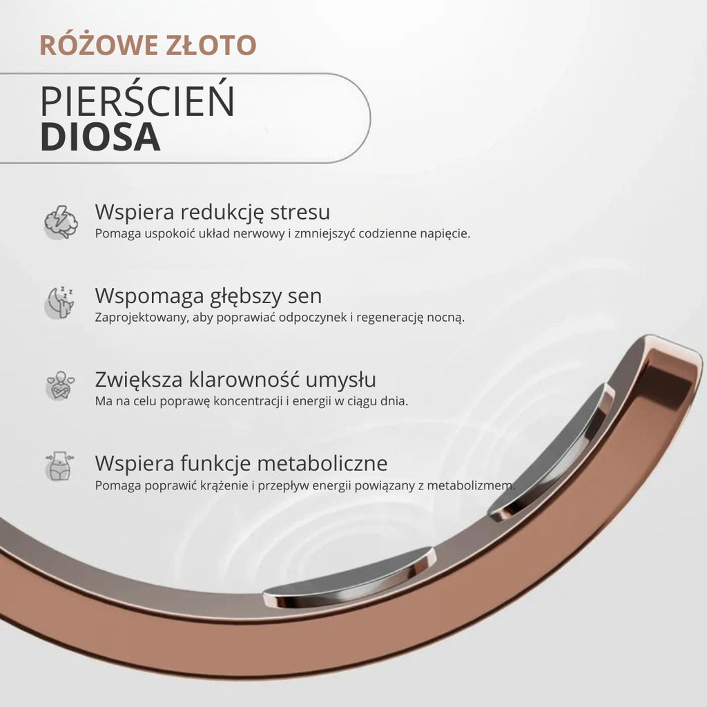 Pierścień Diosa zawiera wbudowane magnesy, które tworzą delikatne pola magnetyczne, mogące wspierać krążenie, relaks i naturalne procesy regeneracyjne.