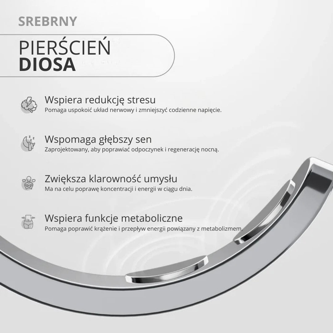 Ręcznie wykonany z hipoalergicznej stali nierdzewnej, pierścień Diosa łączy elegancki design z czterema terapeutycznymi magnesami, wspierając spokój, sen i codzienną równowagę. Regulowany, wodoodporny i stworzony do noszenia każdego dnia. Bez ładowania. Bez aplikacji. Po prostu czysta magnetoterapia.